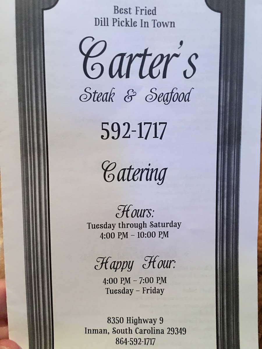 Walking into Carter's Steak & Seafood in Inman, you’re welcomed by a sense of familiar comfort—the kind of place where the rhythms of daily life slow just enough to let you settle in and savor the moment. The atmosphere here strikes a balance between a longtime neighborhood haunt and a quietly refined dining spot, where the hum of friendly conversation blends easily with the warm, inviting lighting. It’s neither rushed nor ostentatious; instead, it offers a reassuring pace, encouraging you to relax and enjoy the company you’ve come with, or soak in the casual hum of the room if you’re dining solo.