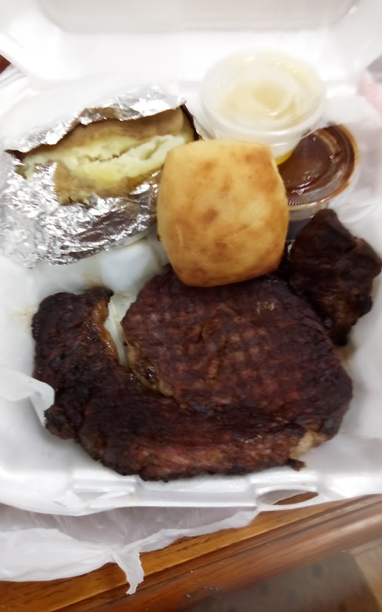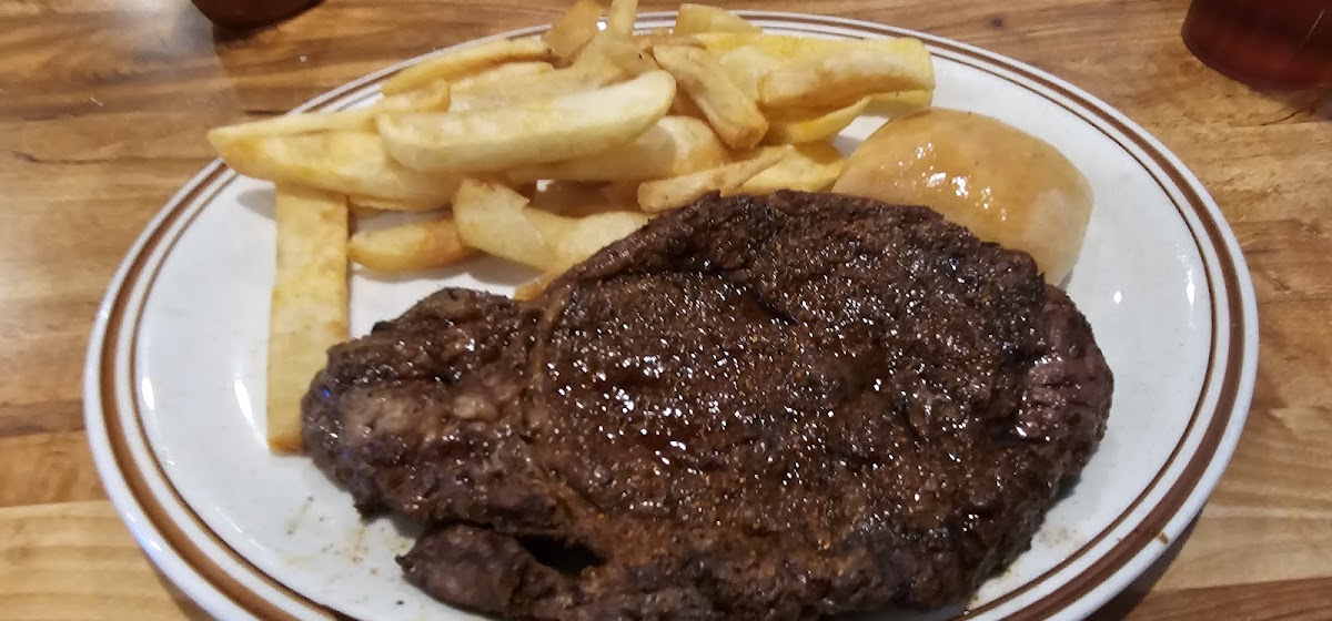 Great atmosphere and very clean. Our server Wendy was super friendly. We started out withe the onion rings which we got with ranch and honey mustard. They were crunchy with a very light batter which I liked. My wife got the fish sandwich that was very good and too much for her to finish. I got the 12oz Ribeye with the loaded baked potatoes and steamed broccoli. The steak was a little under seasoned for me but a little salt and pepper fixed that. I ordered it medium rare and the cook got that perfect. All in all It was a good meal and a good price. I would recommend this place to everyone. They have a nice bar with a couple TVs but it's not a sports bar. They also had a pretty good selection at the bar.